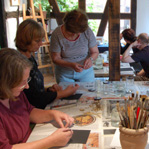 Im Herzen Rheinbreitbachs, am Rande des Siebengebirges, befindet sich das Atelier-Röner. Mitten im Ort liegt das idyllische Fachwerkhaus, in dem Leben und kreatives Arbeiten harmonisch miteinander verbunden sind. 1999 beschloss ich mein Atelier hierher zu verlegen um neben meiner künstlerischen Tätigkeit, auch Kurse im Atelier anzubieten. Die gemütliche Atmosphäre der Räumlichkeiten und des Hofes, der im Sommer gerne genutzt wird, lädt zu gemeinsamen kreativen Stunden und geselligem Beisammensein ein.